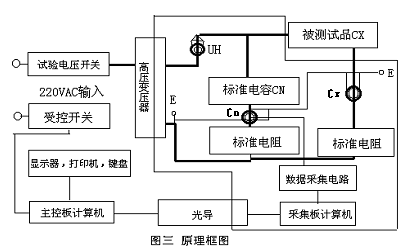 TPJSC系列智能化抗干擾介質損耗測試儀測量線路包括一路標準回路和一路測試回路,如圖三所示。標準回路由內置高壓穩定度標準電容器與標準電阻網絡組成,由計算機實時采集標準回路電流與測試回路的電流幅值及其相位差,并算出被測試品電容容值(CX)和介質損耗(tgδ)。