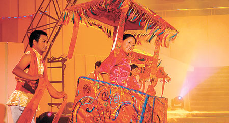 由女角挑擔,男角舞扇,載歌載舞。大都在春節至燈節期間演出,也在民間廟會、集期等民俗活動中出現。所挑花擔是在竹籃里上冬青葉、柏樹枝或青竹枝,掛上紙花,貼上“福”、“壽”或“天下太平”、“五谷豐登”等字樣的紅(金)紙,唱古人、唱花名、唱豐收、祝太平。此舞演出形式活潑,女角挑花擔的動作以屈膝顫步,擺胯為主,使花擔在肩上上下顫動,身體左右晃擺,給人以沉甸甸、顫悠悠的美感。由于受道具的限制,女角手、腿動作變化較少,主要靠歌詞與男角交流感情。男角手執一扇,舞姿多變,動作跳躍,顫步、屈膝、擺胯、搖頸,給人以上身長、下身短的感覺,通過扭腰,擊肩、叉腰、點頭等動作,“輕而不浮,活而不滑”。曲調在都以民歌、小調的旋律,填上新詞進行表演。常用曲調有[四季游春]、[八段景]、[虞美人]、[楊柳青]等。樂器以嗩吶、笛子、二胡為主,過門時加打擊樂器,使氣氛更加熱烈。