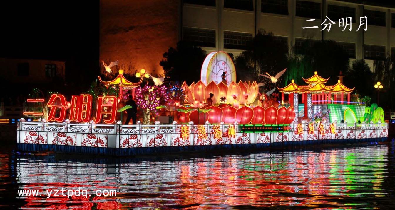 由蜀岡—瘦西湖風景名勝區制作的領航花船“二分明月”號。該花船以國家5A級風景區蜀崗—瘦西湖為藍本建構。風姿卓越獨樹一幟的五亭橋,寓意著幸福年年,代表著人類的智慧與巧思。皇家珍藏移步換景的白塔,見證著鹽運的發達,代表著至高的榮耀與尊寵。亭臺軒榭、層巒疊嶂、青山掩翠、桃紅柳綠,好一個荷塘月色,人間仙境。