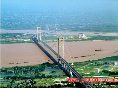 潤揚長江公路大橋是江蘇省“四縱四橫四聯”公路主骨架和跨長江通道的重要組成部分。工程全長35.66公里(南延伸段12公里),由北接線、北接線高架橋、北引橋、北汊斜拉橋、世業洲互通、南汊懸索橋、南引橋、南接線、南接線延伸段9個部分組成。南汊懸索橋主跨1490米,是目前中國第一、世界第三的特大跨徑懸索橋;北汊橋采用(176+406+176)米的三跨雙塔雙索面鋼梁斜拉橋,全線采用雙向六車道(南延伸段四車道)高速公路標準,計算行車速度100公里/小時,南延伸段120公里/小時。大橋通航凈空懸索橋為50米,可通過5萬噸級貨輪,斜拉橋為18米。