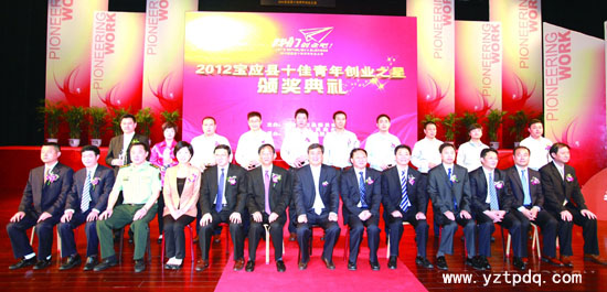 頒獎典禮結束前,寶應縣領導上臺與2012“寶應縣十佳青年創業之星”獲獎者合影留念。