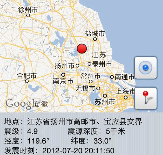 據揚州市地震臺網中心測定,2012年7月20日20時11分在揚州高郵、寶應交界(北緯33.0度,東經119.6度)發生4.9級地震。