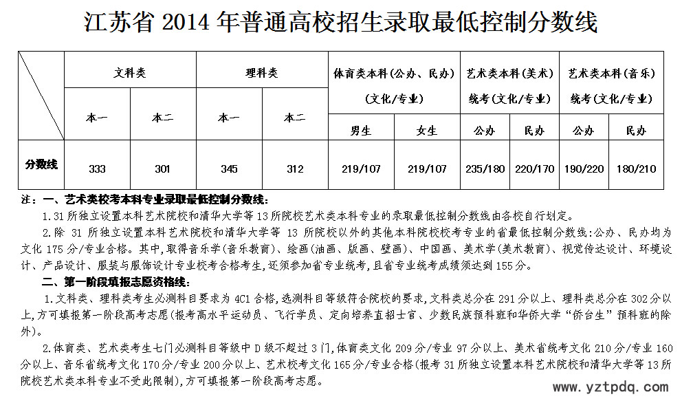 2014年6月24日下午,江蘇省高校招生委員會召開會議,審議通過了2014年江蘇省普通高校招生第一階段錄取各批次省最低控制分數線。其中,文科:一本333、二本301;理科:一本345、二本312;藝術(文化/專業)公本235/180、民本220/170; 體育(文/專)男219/107、女219/107。