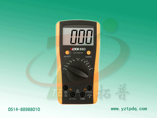 6、自恢復保險管保護電路設計。 基本功能 量程. 基本準確度 直流電壓 200mV/2V/20V200V/1000V ±(0.5%+4) 交流電壓 200mV/2V/20V/200V/750V ±(1.0%+6) 直流電流 200uA/2000uA/20mA/200mA / ±(0.8%+6) 交流電流 200uA/2000uA/20mA/200mA / ±(1.0%+6) 電阻 200Ω/2kΩ/20kΩ/200kΩ/2MΩ/20MΩ ±(0.8%+4) 攝氏溫度 (-20-1000)℃ ±(0.8%+4) 華氏溫度 (0-1832) oF ±(0.75%+5) 特殊功能 VICTOR 89D 二極管測試 √ 通斷報警 √ 低電壓顯示 √ 自動關機 √ 功能保護 √ 自恢復保險 √ 防震保護 √ 輸入阻抗 10MΩ 采樣頻率 3次/s 交流頻響 (40-400)Hz 操作方式 自動量程 顯示 1999  液晶顯示 65× 電源 9V  (